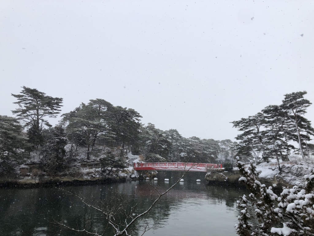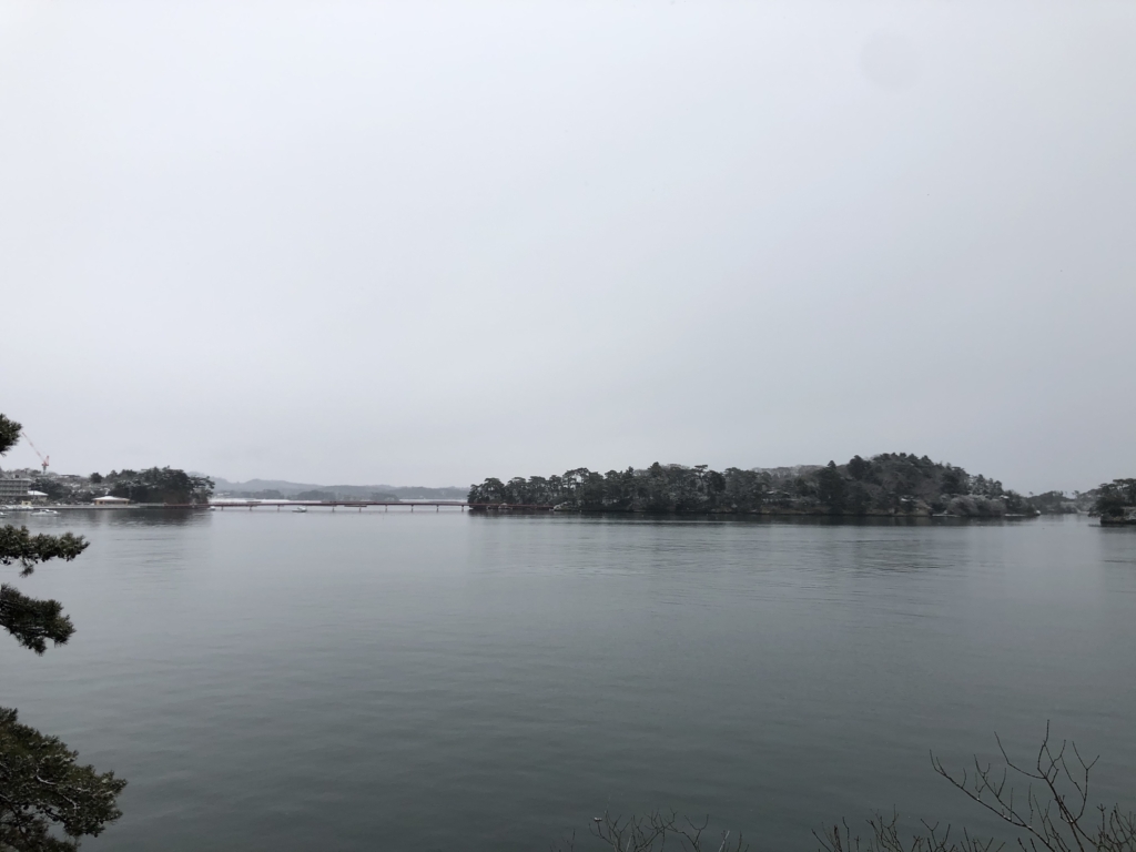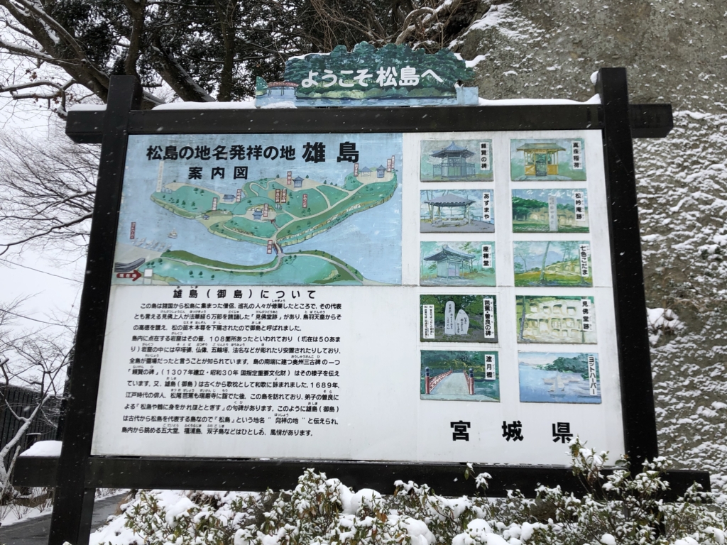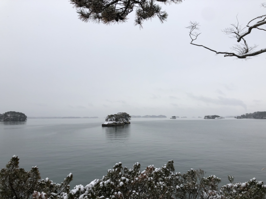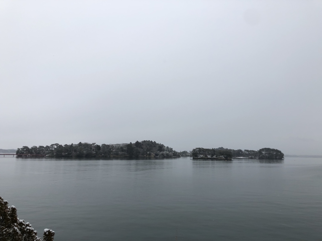 青空に青い海、緑の島々というイメージの松島とはずいぶん違う雪景色です。