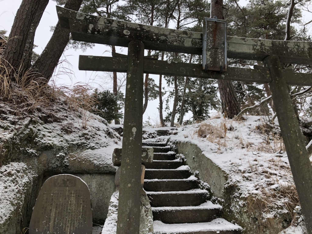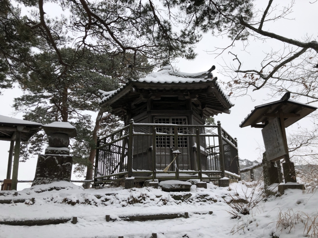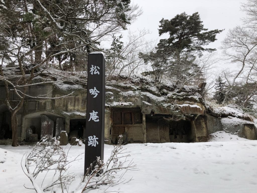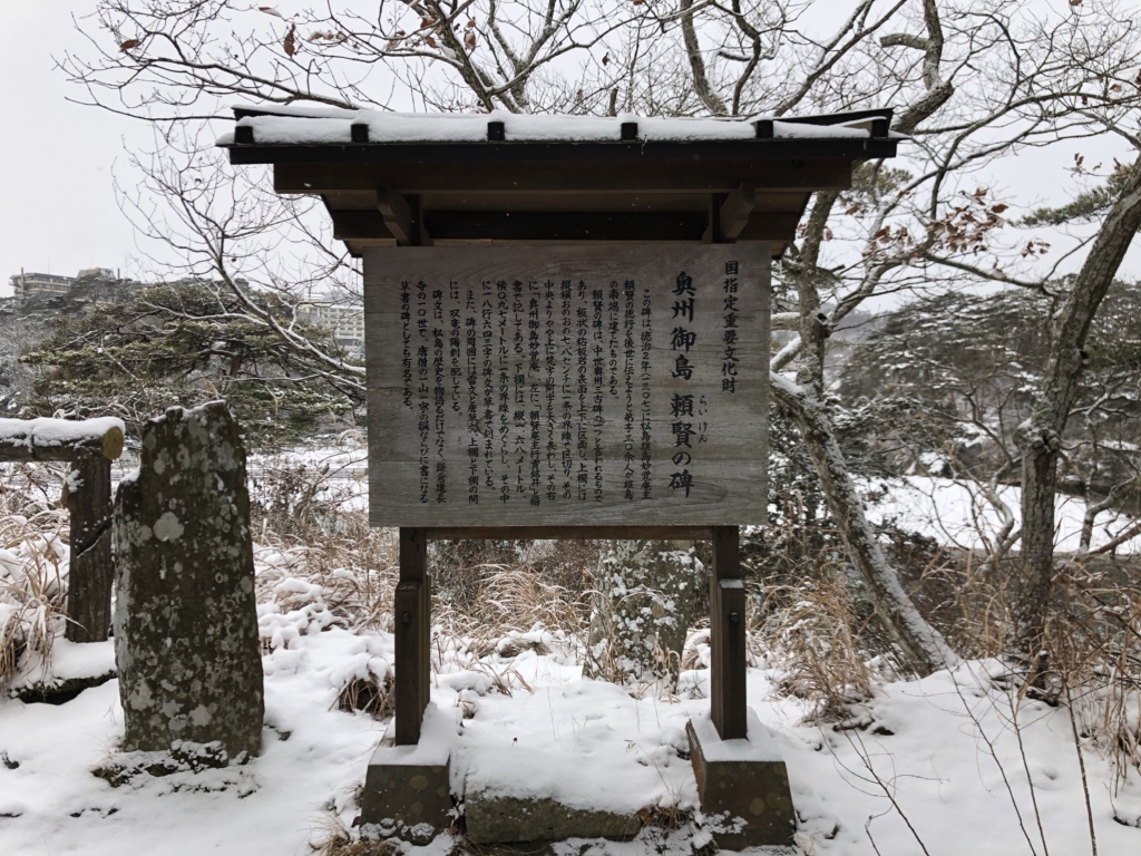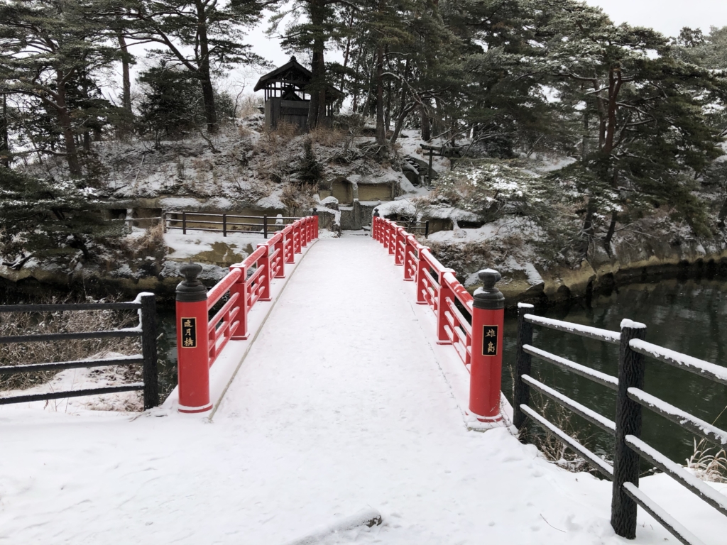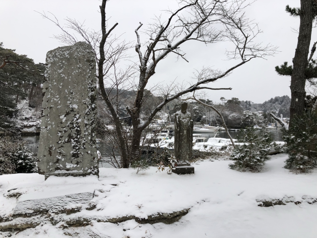 青空に青い海、緑の島々というイメージの松島とはずいぶん違う雪景色です。