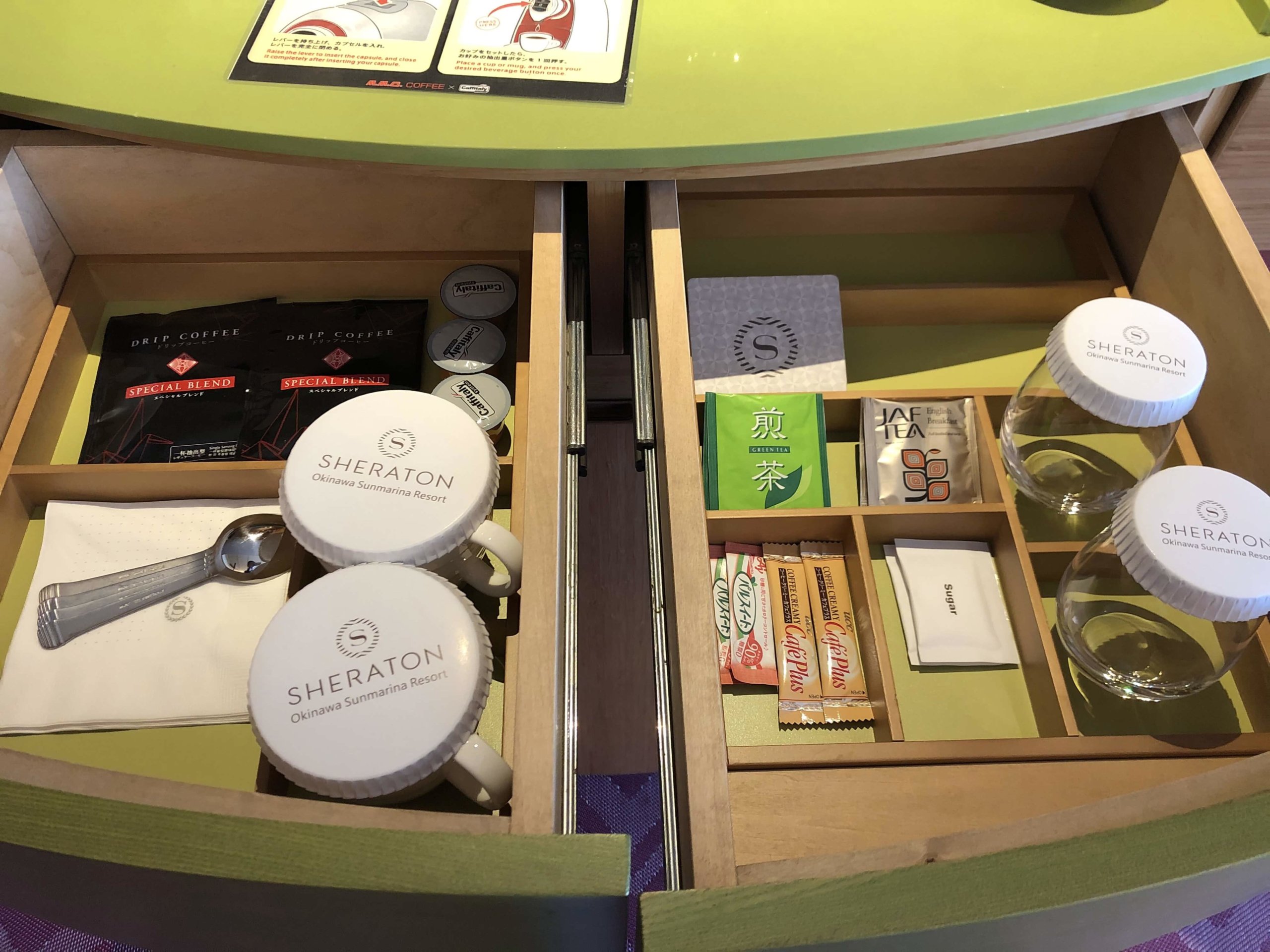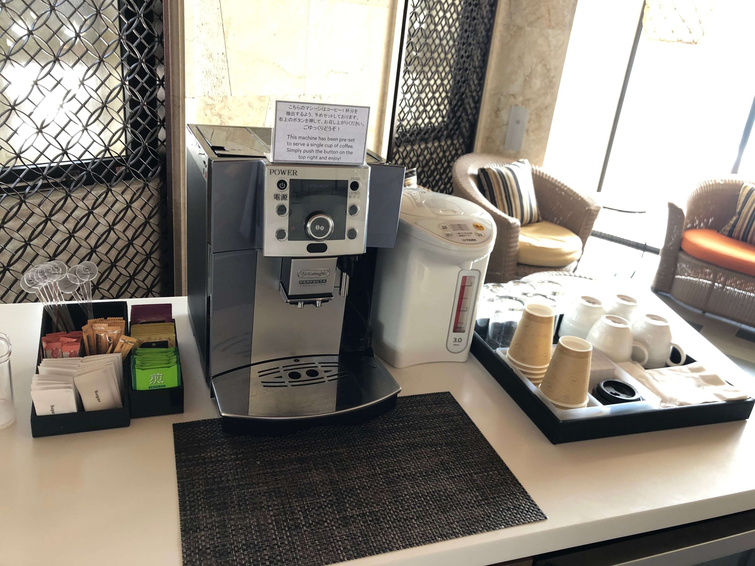 コーヒーマシン。紙コップがあるのでお部屋に持っていっていいのかなと思って持っていきました。