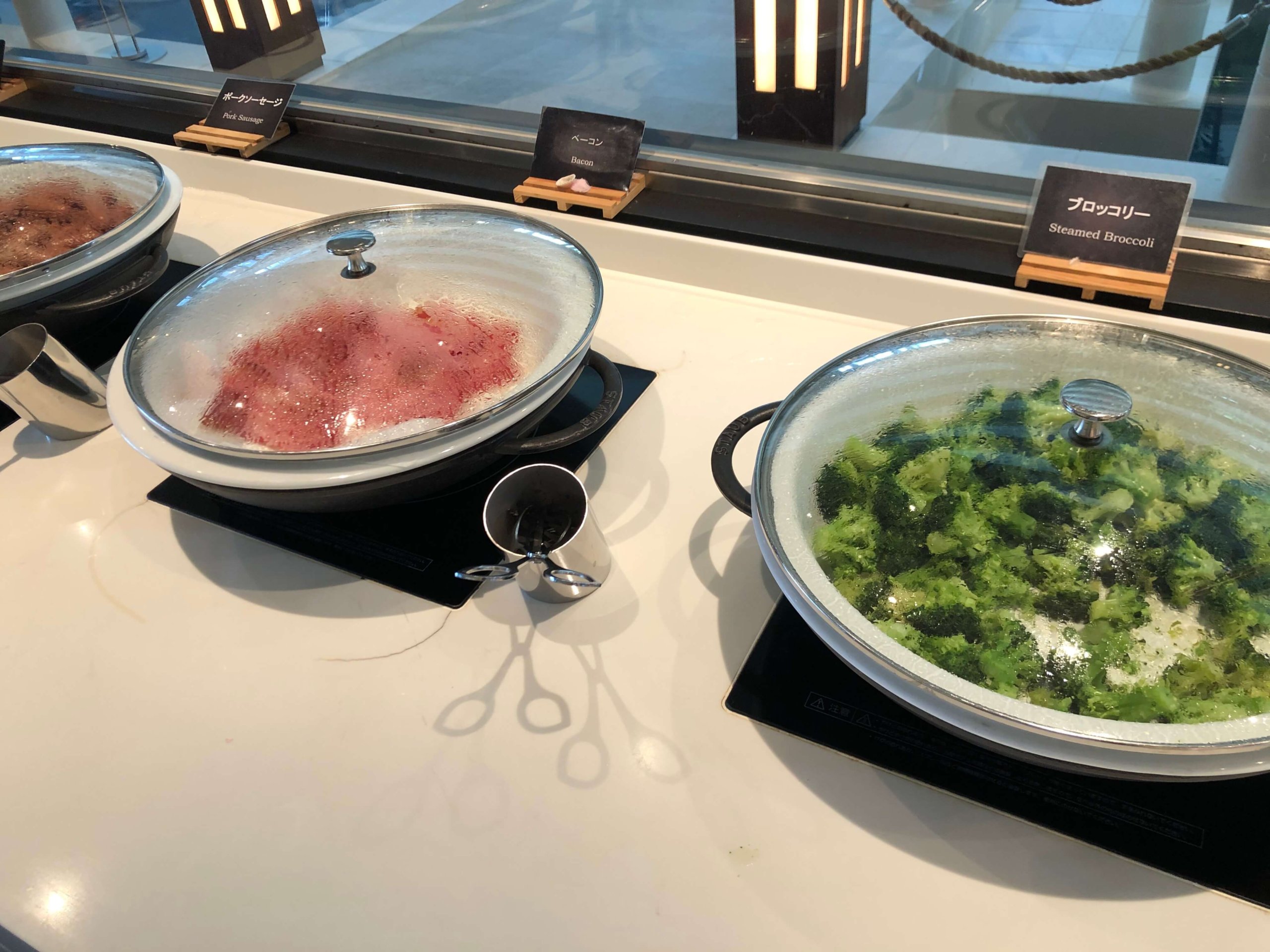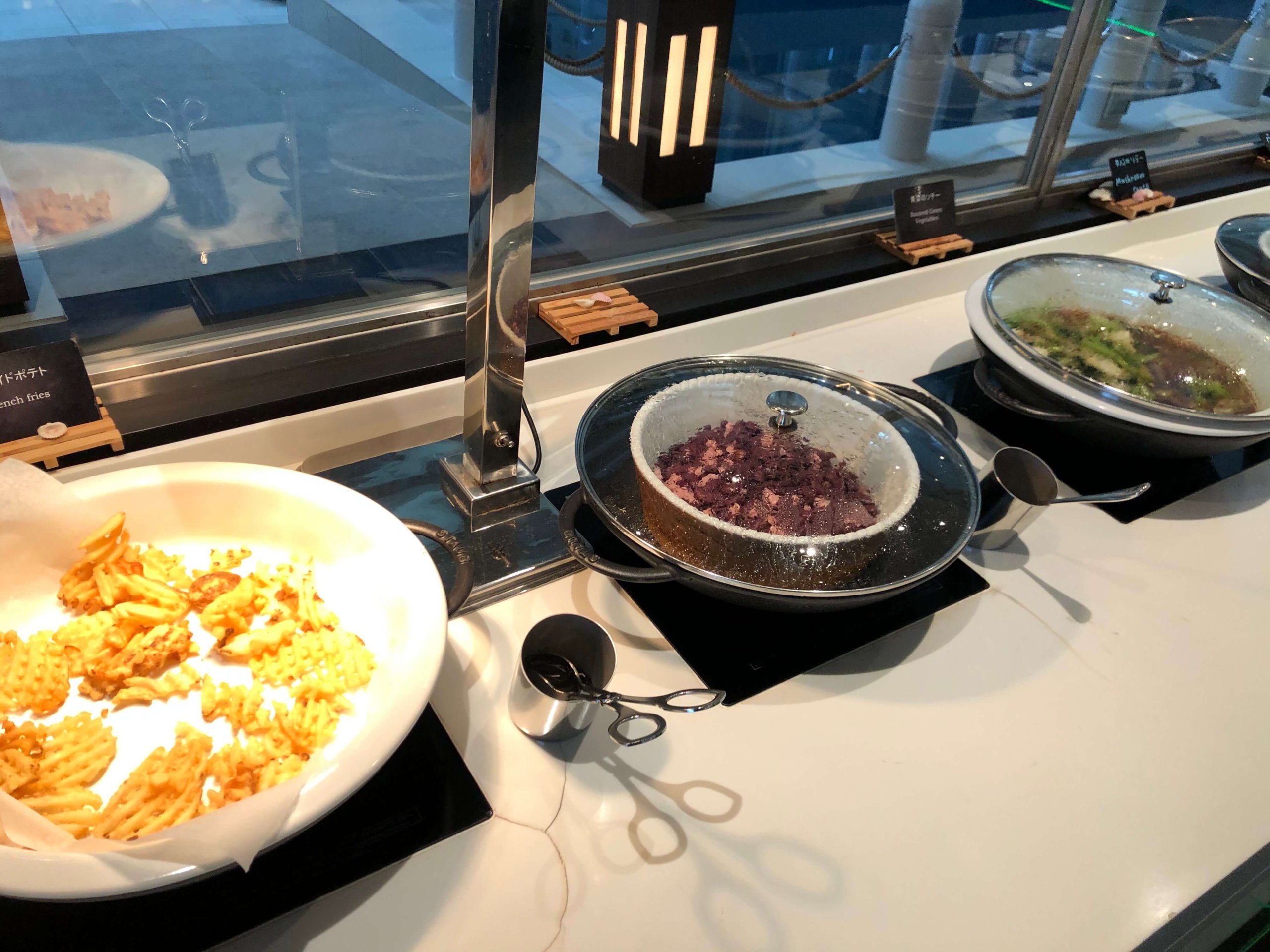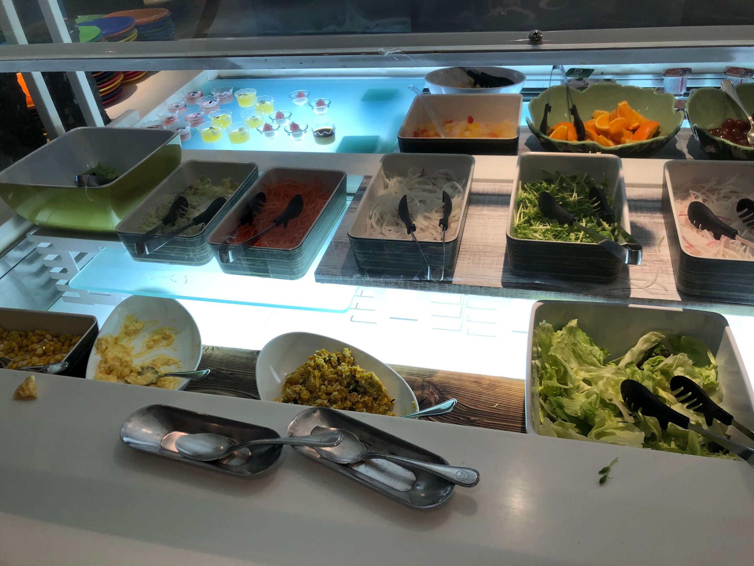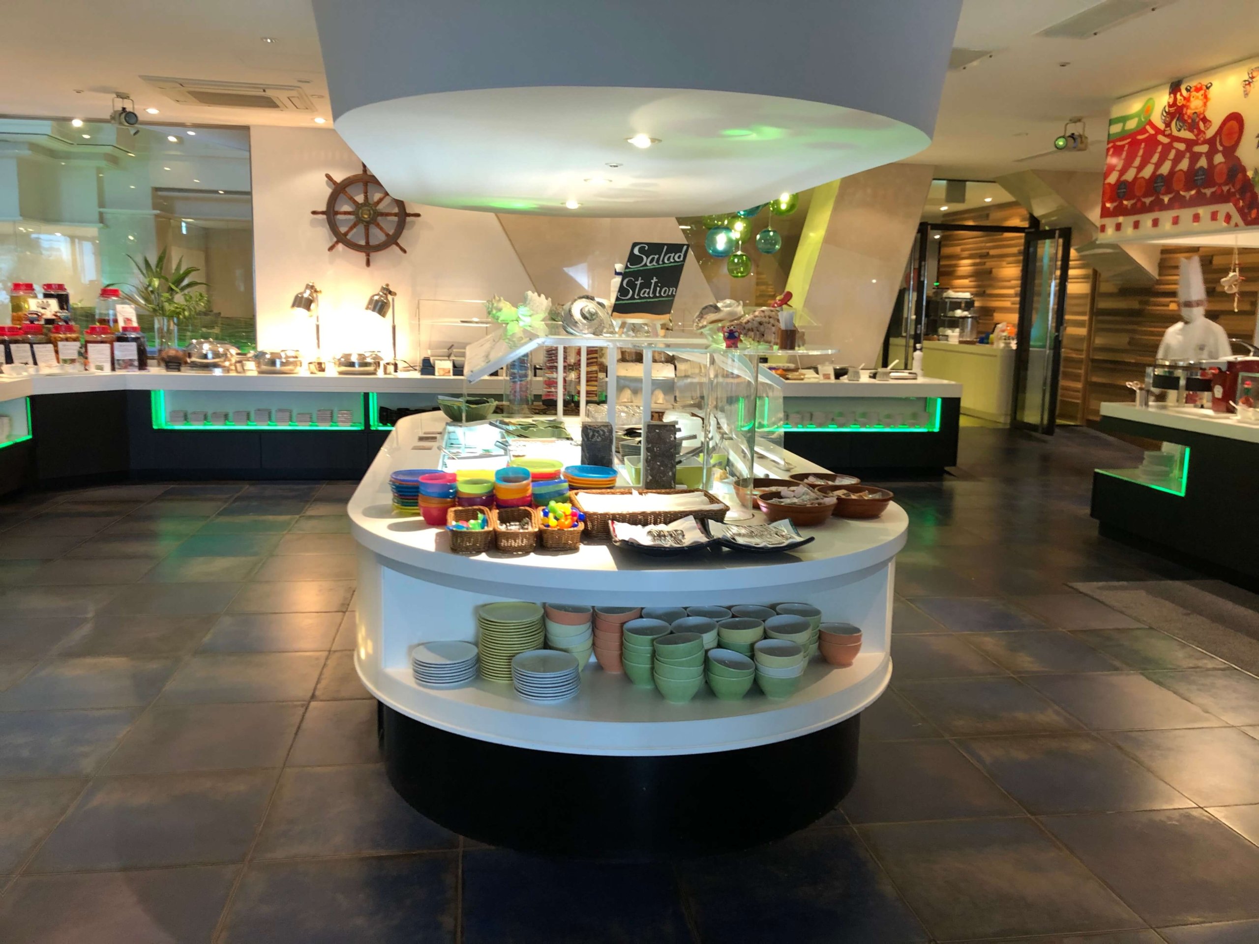 たまたまビュッフェ台に誰もいませんでした。真ん中にサラダが並んでいて、左側と奥にホットミールが並び、右側がキッチンになっています。