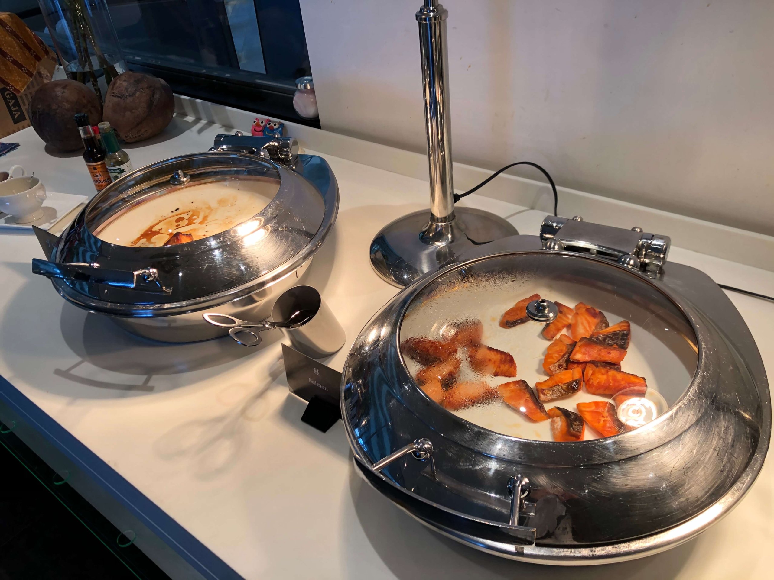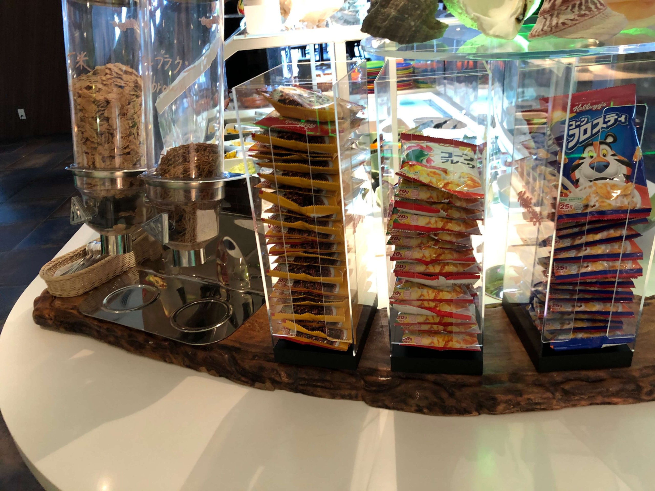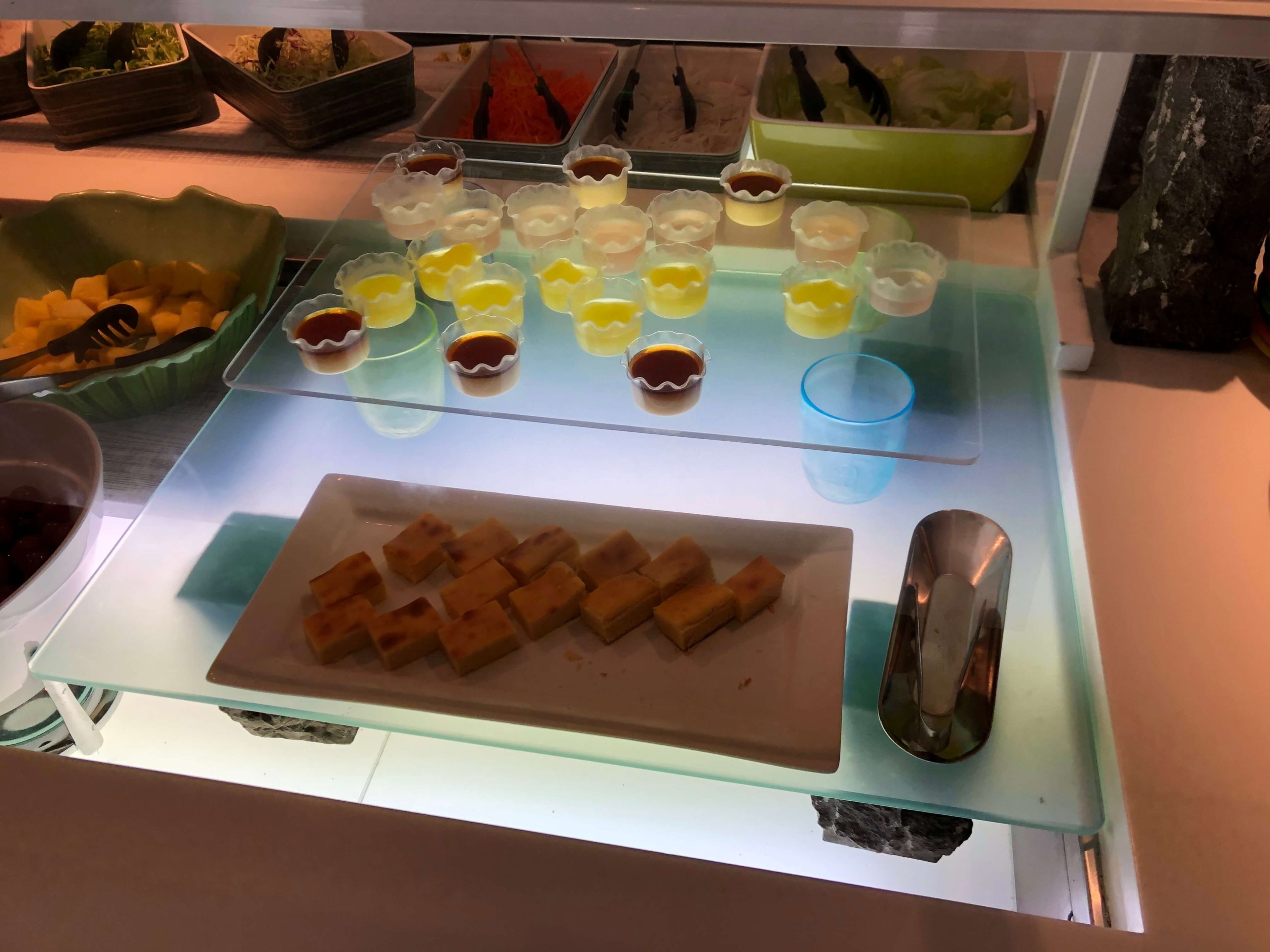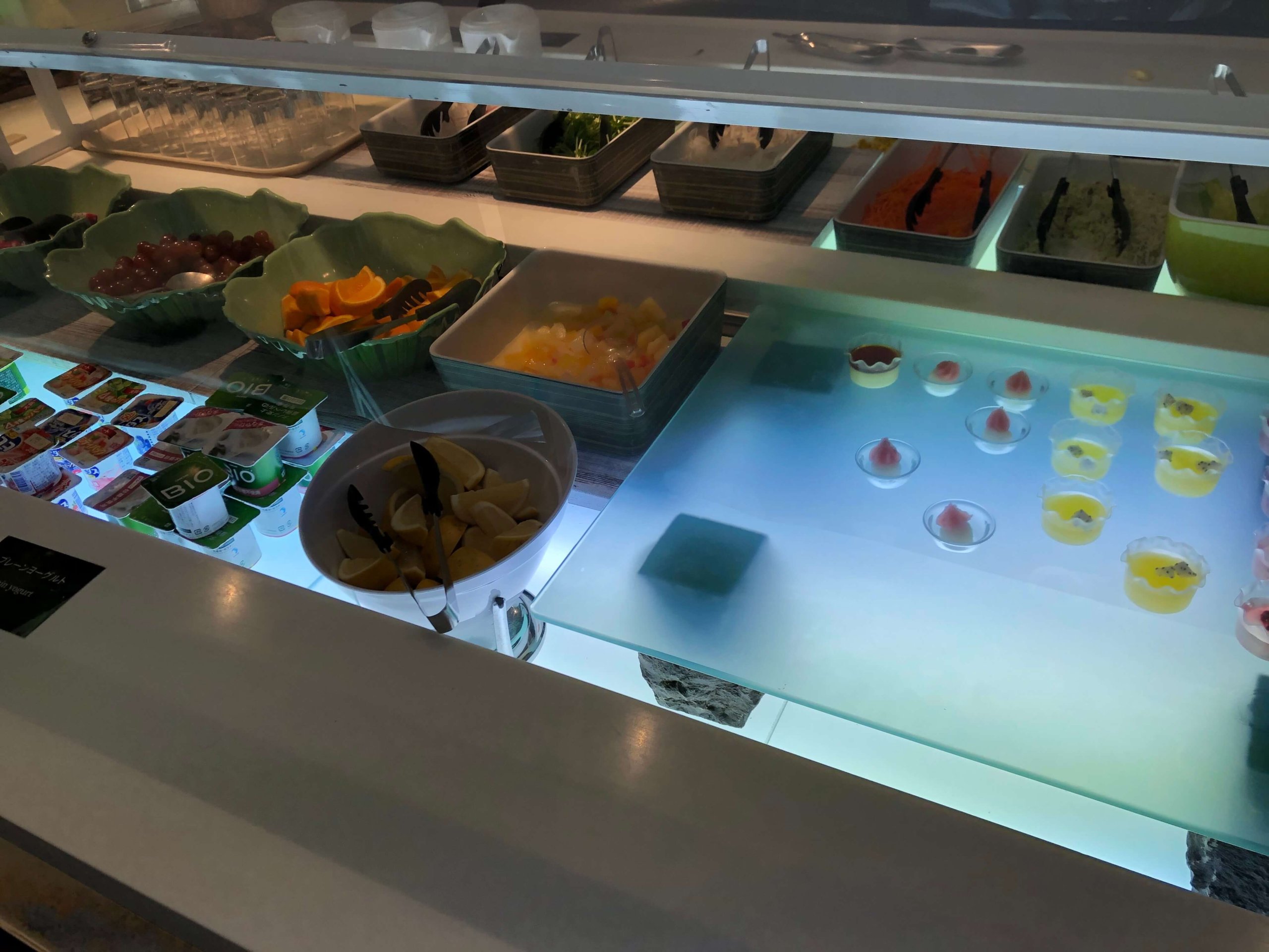 たまたまビュッフェ台に誰もいませんでした。真ん中にサラダが並んでいて、左側と奥にホットミールが並び、右側がキッチンになっています。