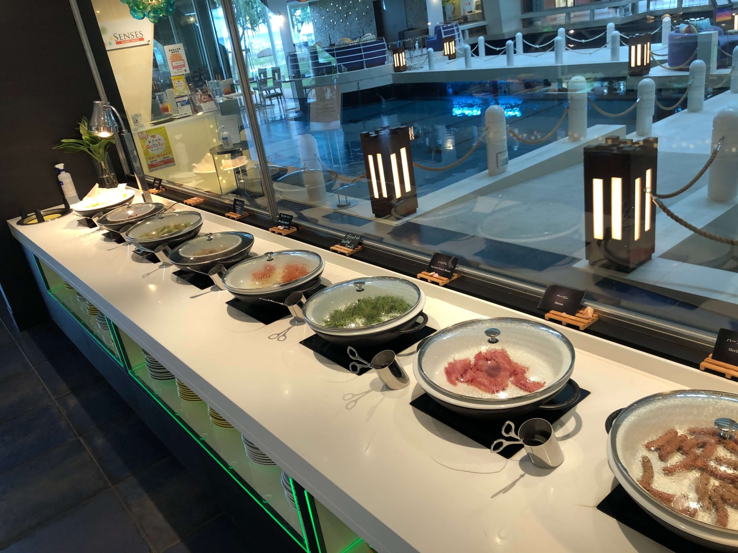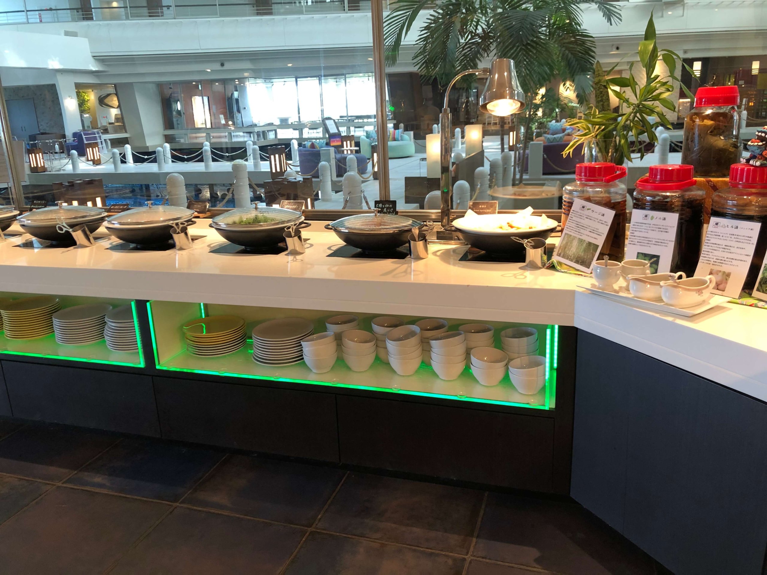 2人席に案内してもらって、お料理を見に行きます。ビュッフェ台から近い席だったので便利でした。