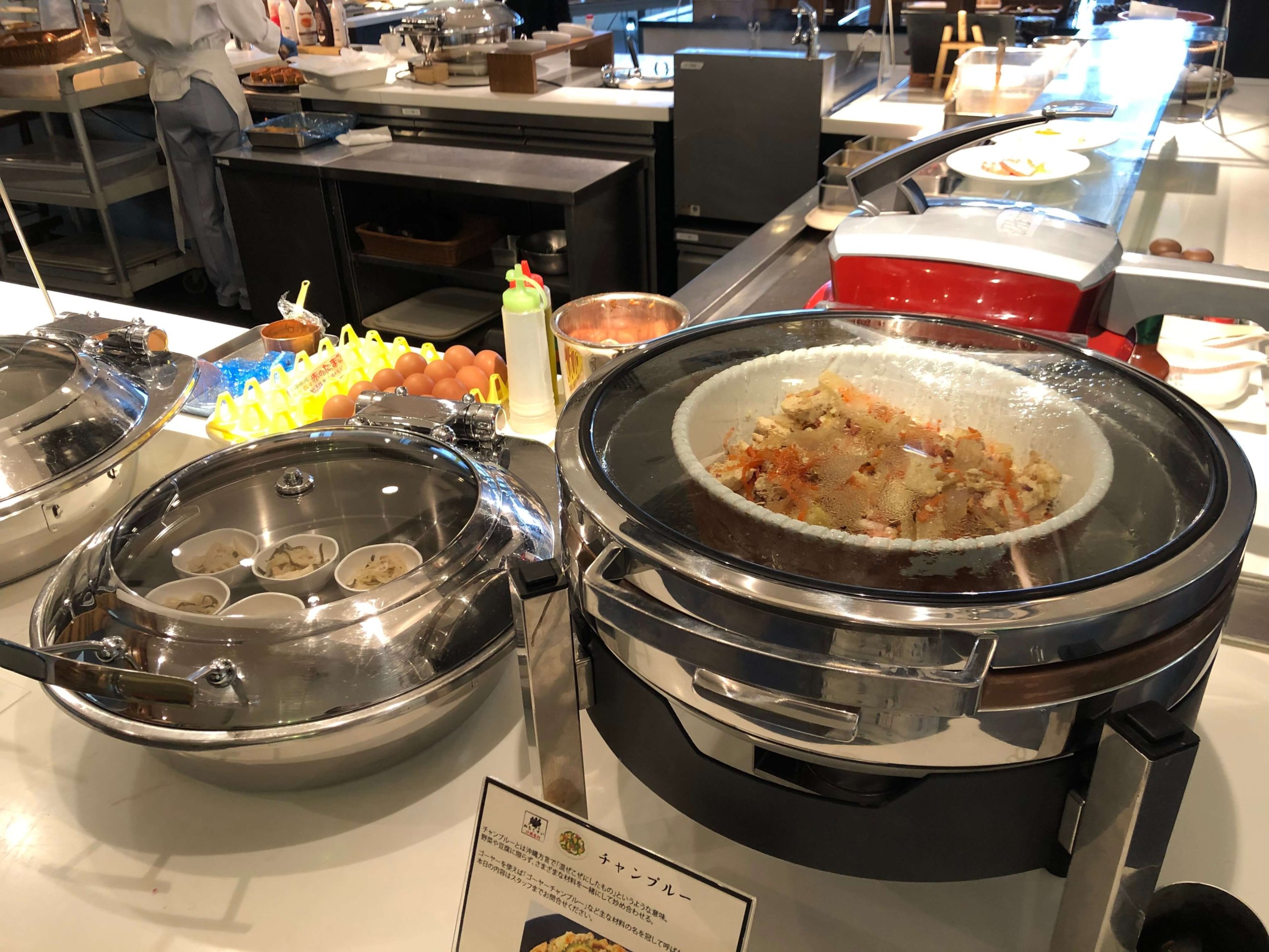 オムレツにはたらことチーズを入れてもらいました。沖縄料理もたくさんもらいました。
