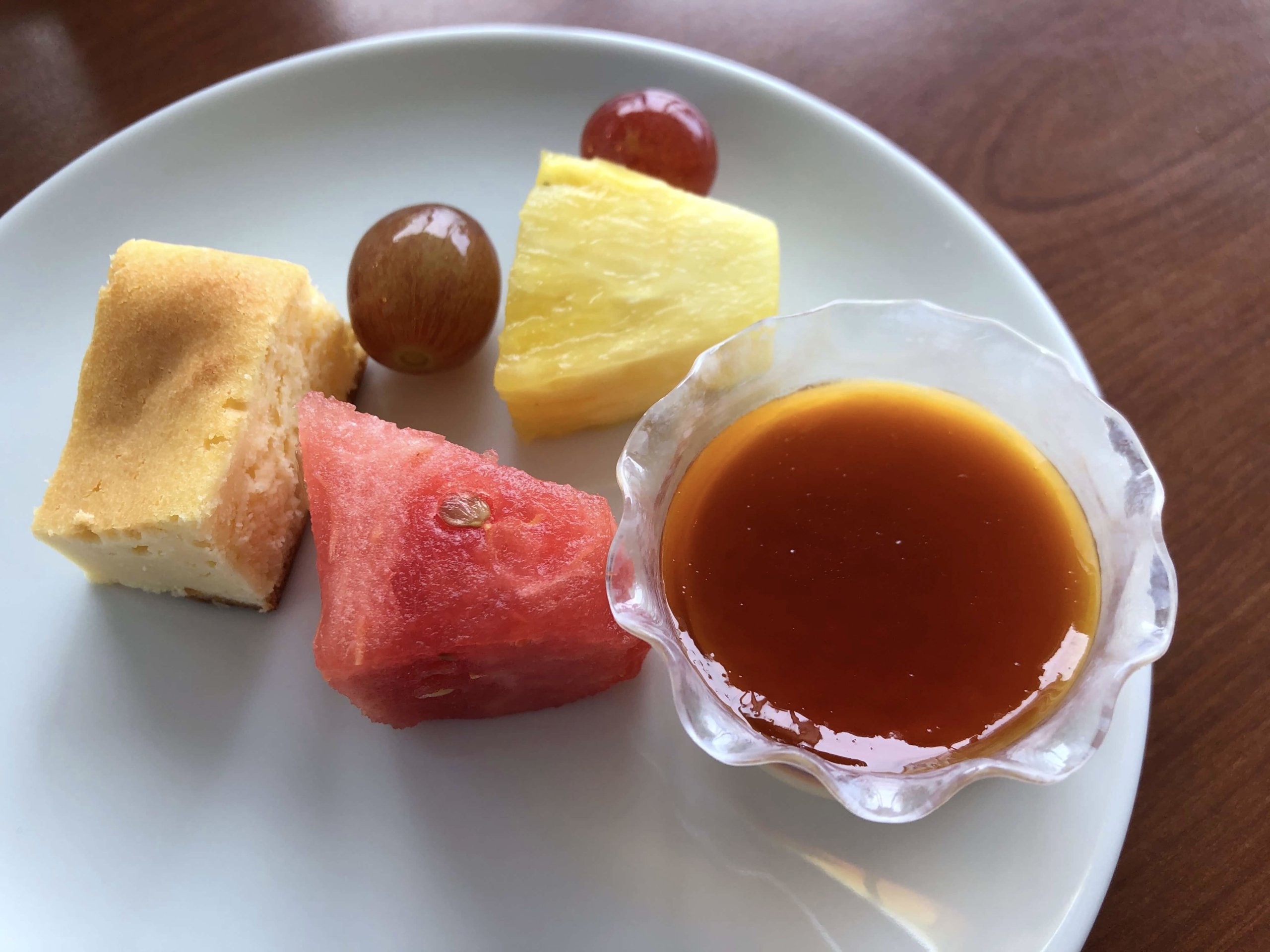 デザートのプリンとゼリー。ミニケーキもありました。