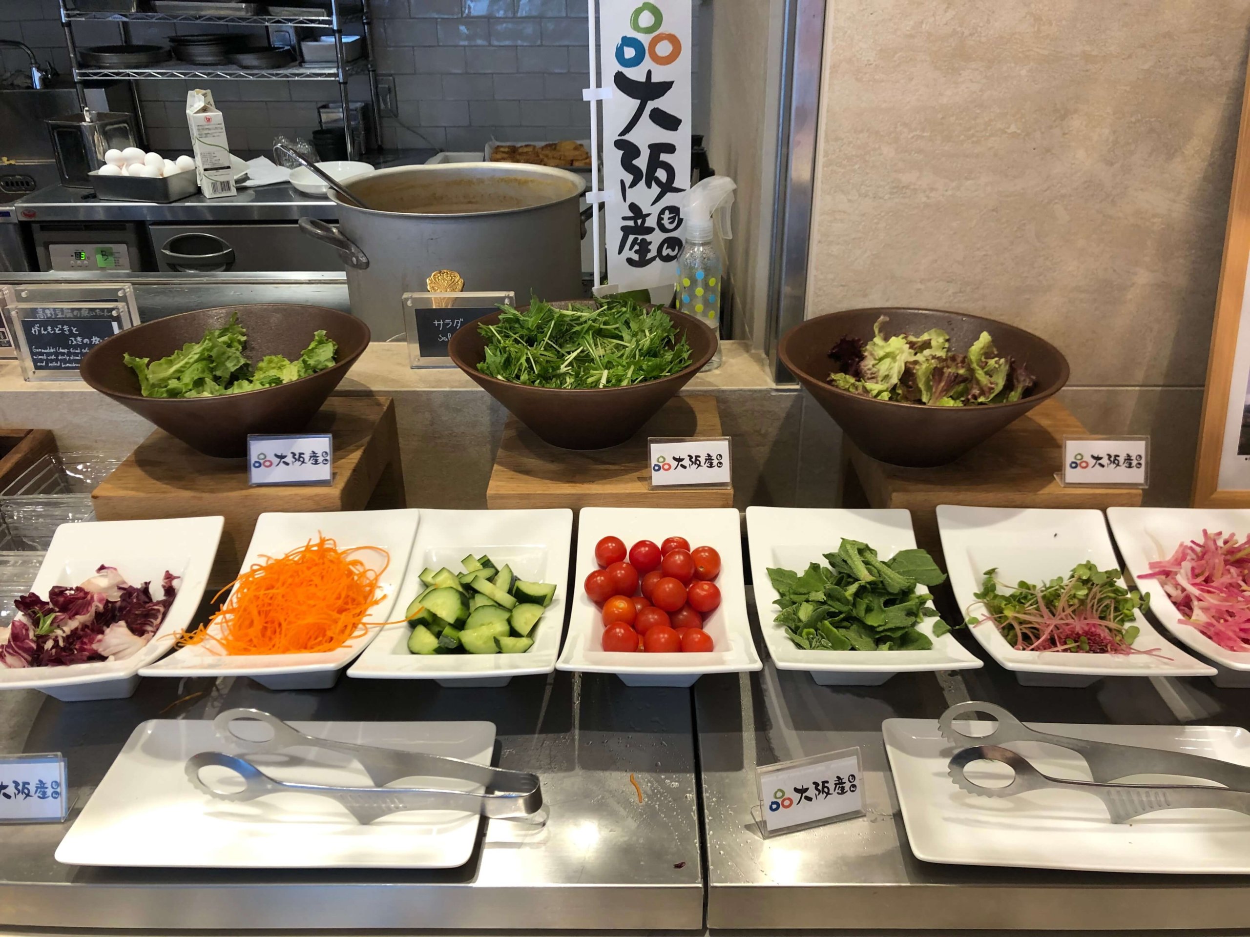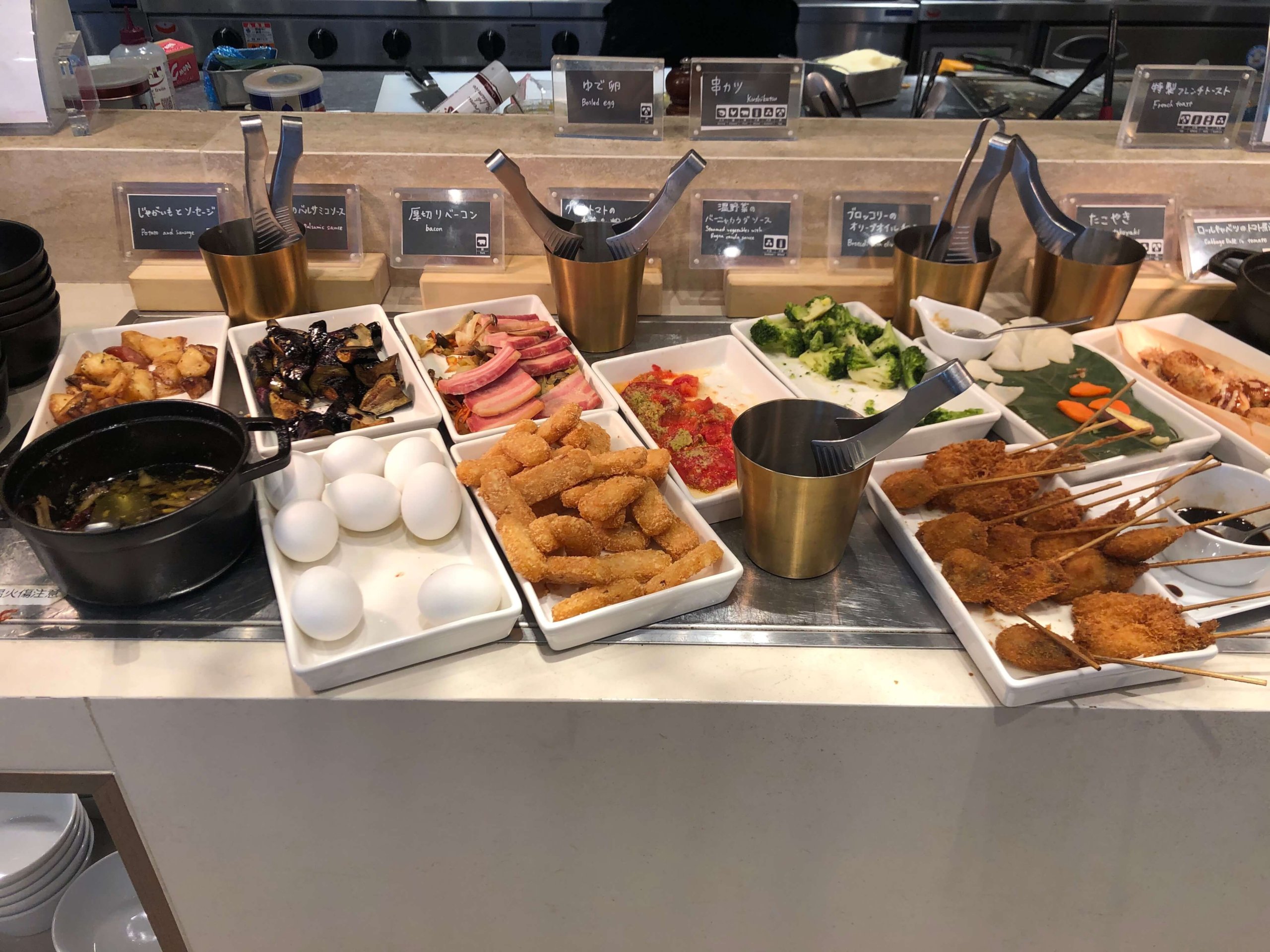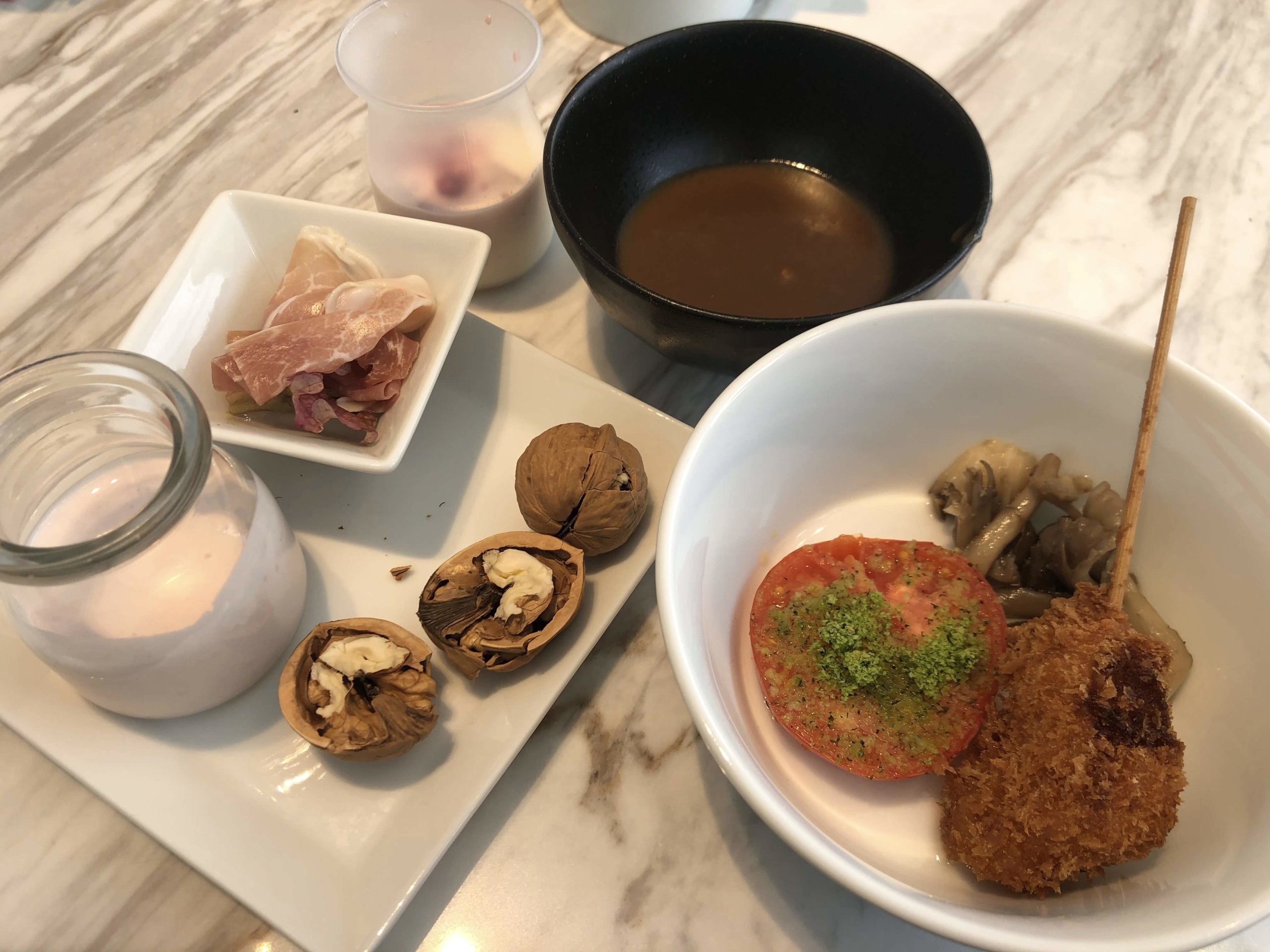 焼きトマト、串カツ、カレー、生ハム、ヨーグルト、くるみ、パンナコッタ