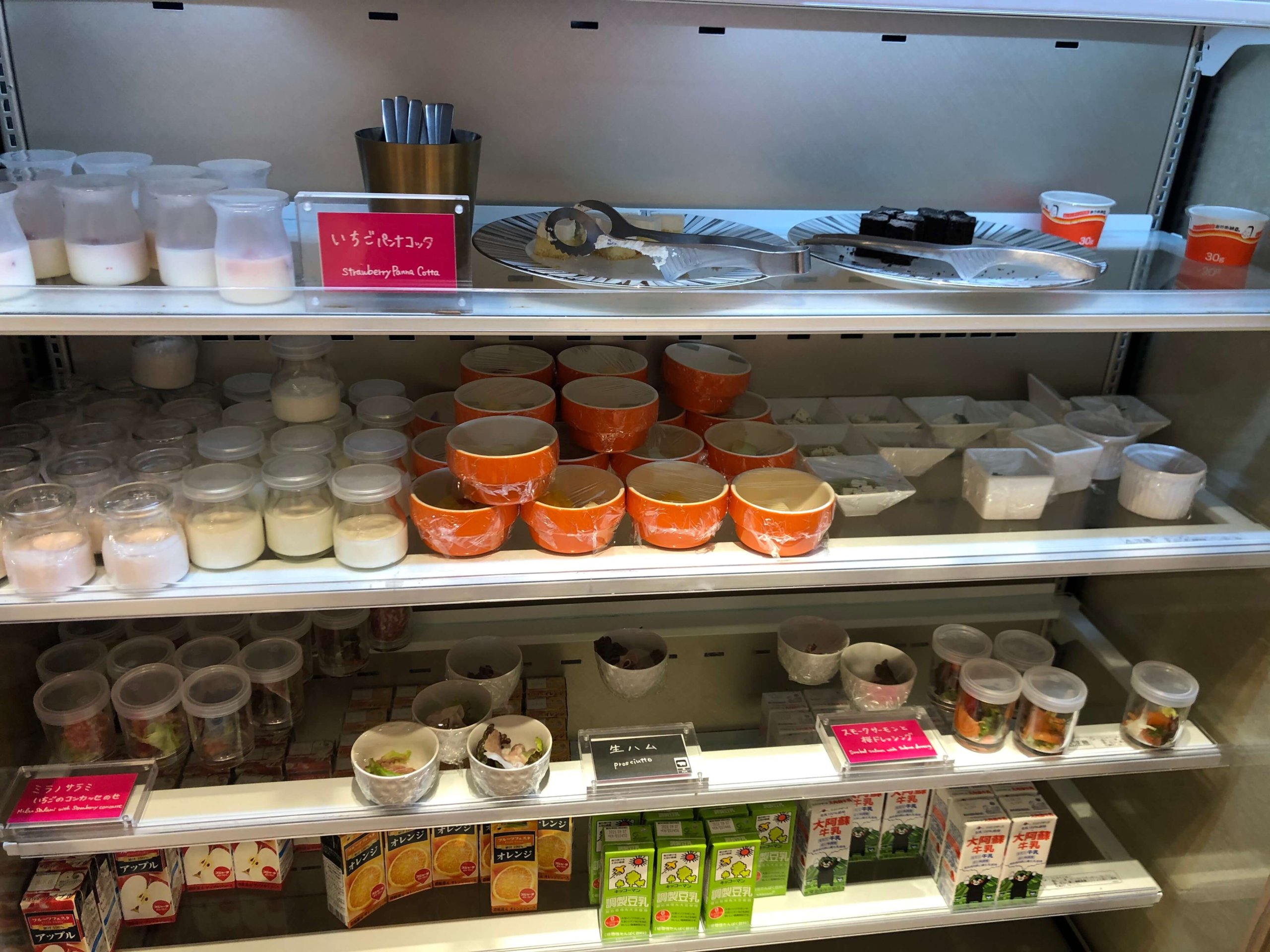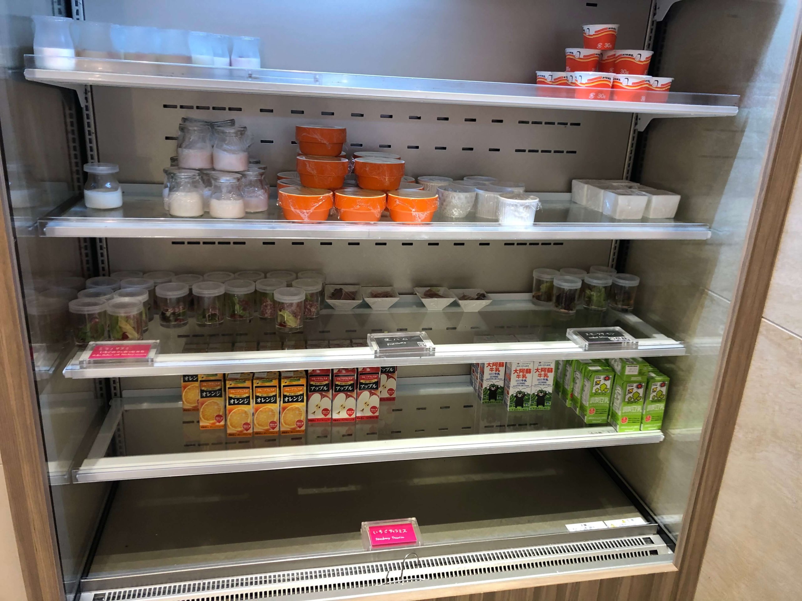 冷蔵庫が前日より豊富でした。上段にケーキがあります。納豆の横にね。