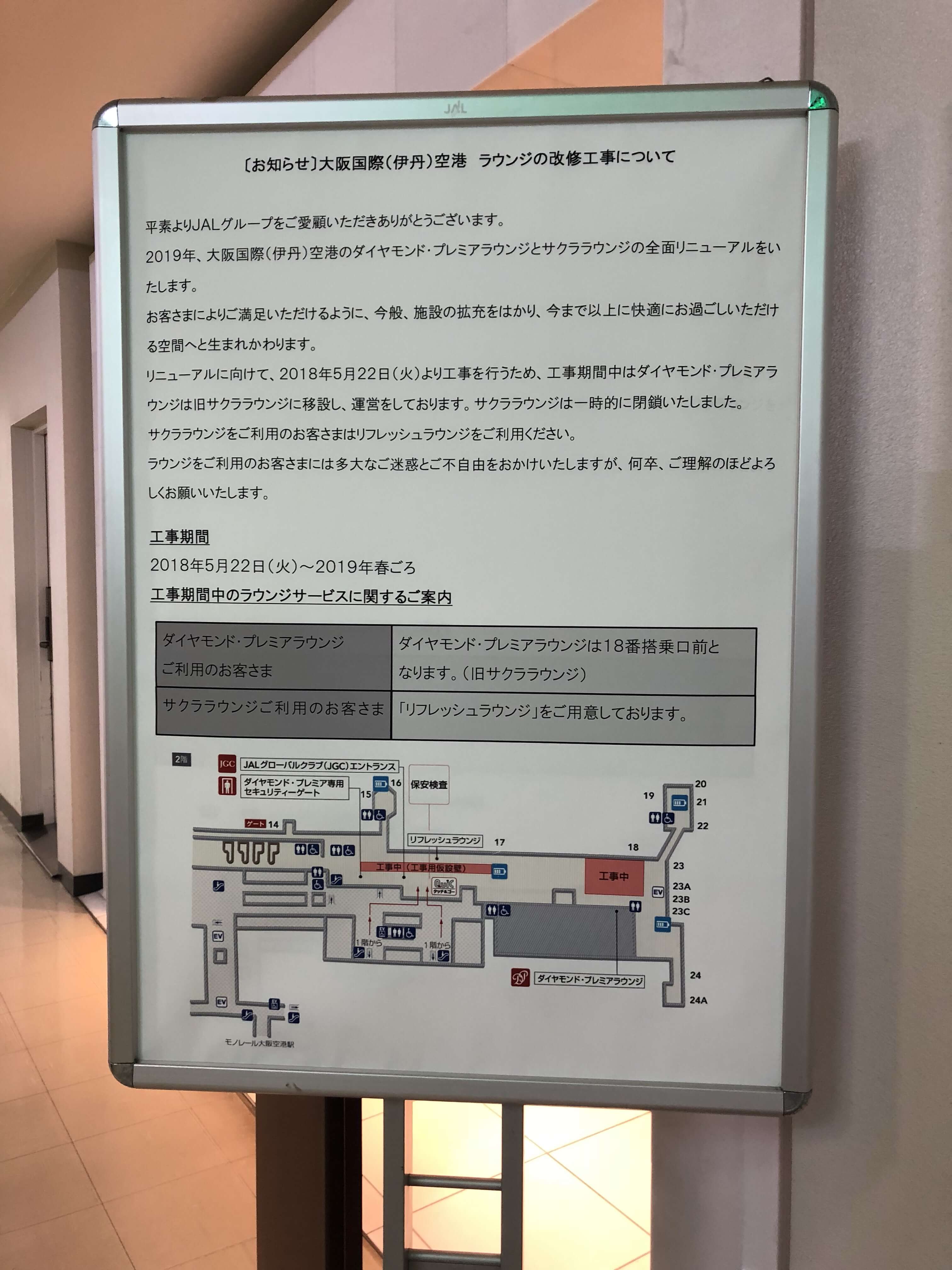 18番ゲート前の前サクララウンジだったところをダイヤモンドプレミアラウンジにしているのでそちらへどうぞと書いてありました。