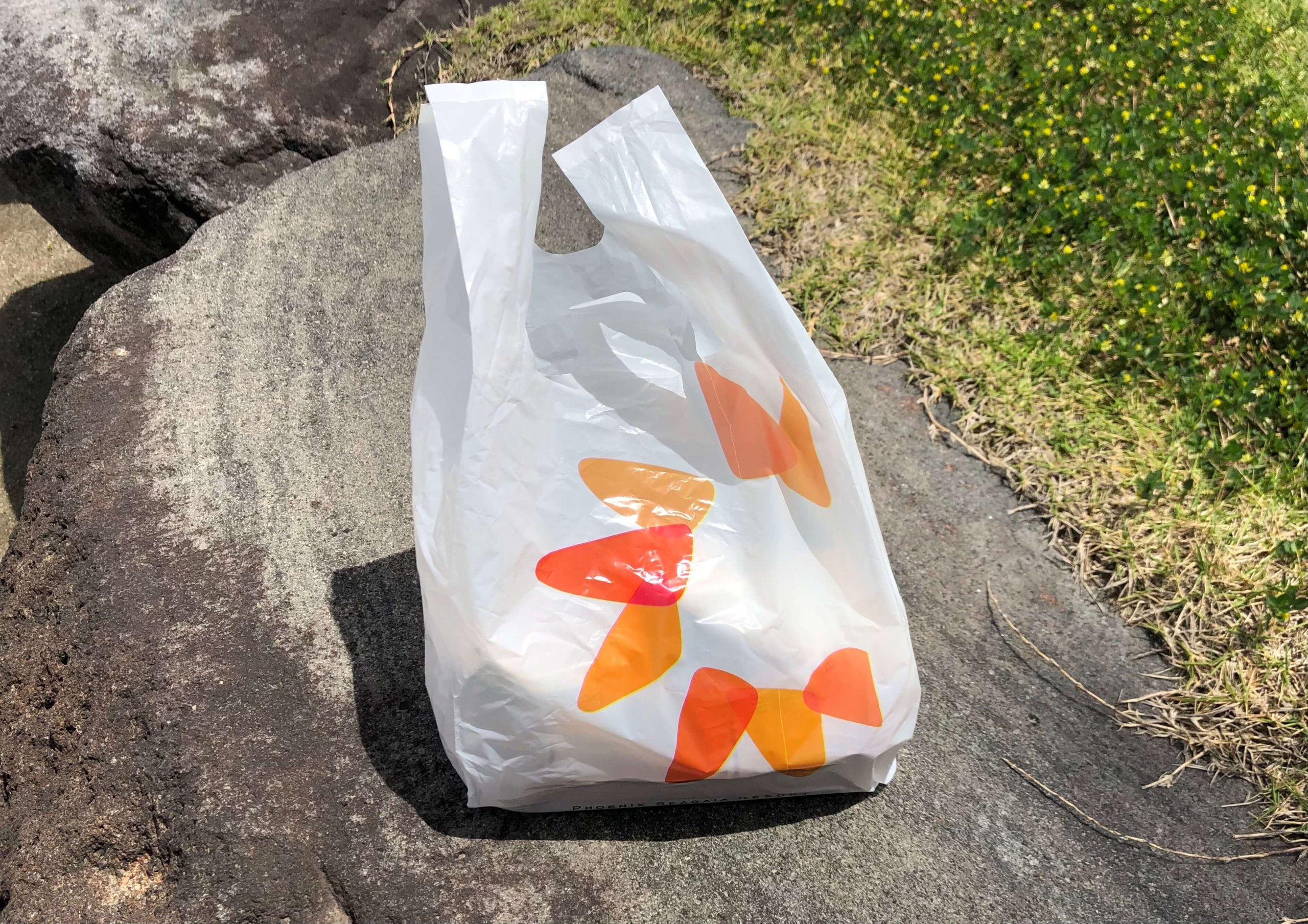 屋根がないところしかなかったので、戻って屋根なしのベンチに座ってもよかったのですが戻るのは面倒で。石垣から海も見れたしまぁそんな大層なお弁当を食べるわけでもないのでよしとします。