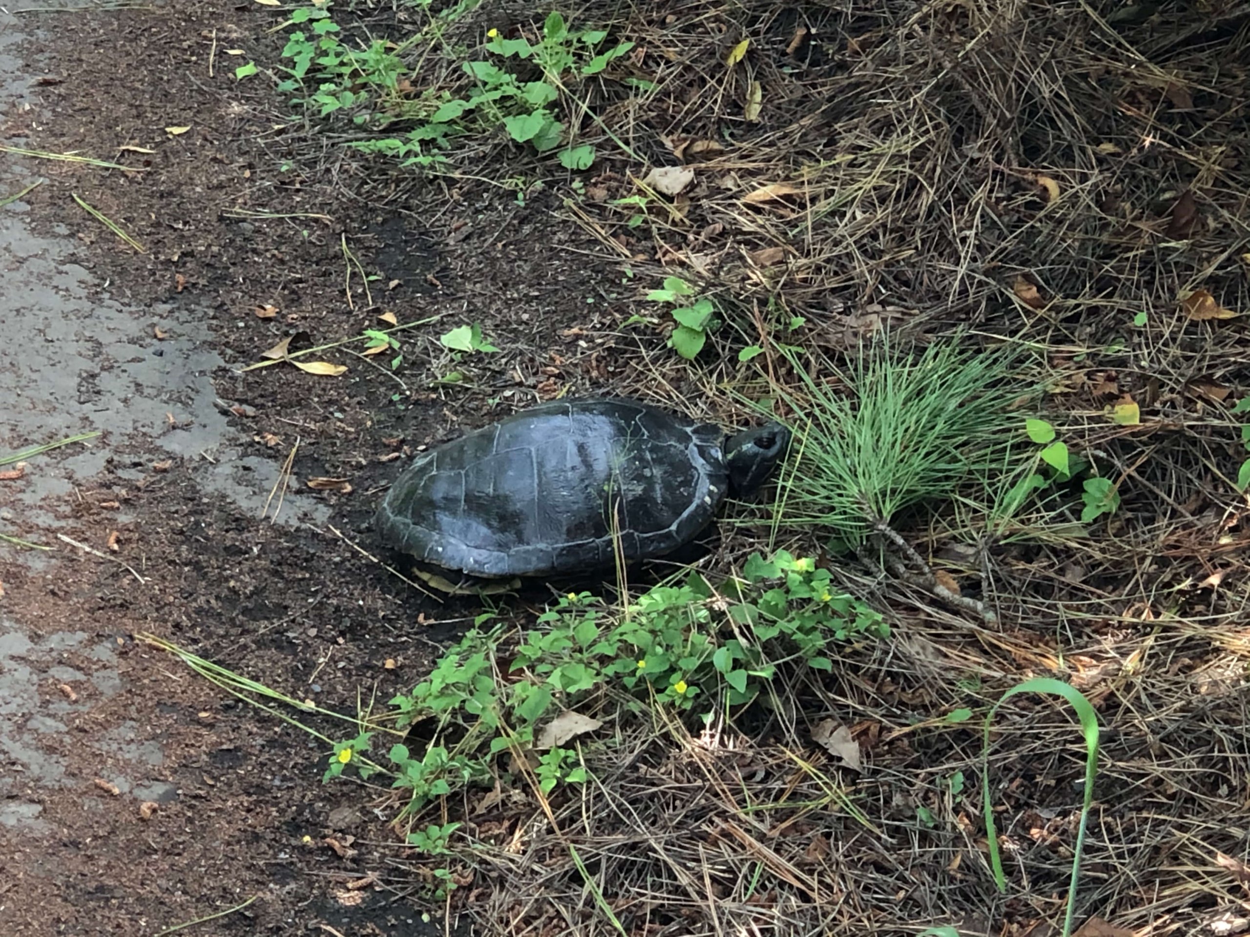 御池に向かっている途中、道路を亀が横断していました。写真を撮ろうと思って近づくと顔と手足を甲羅に引っ込めて動かなくなってしまいました。